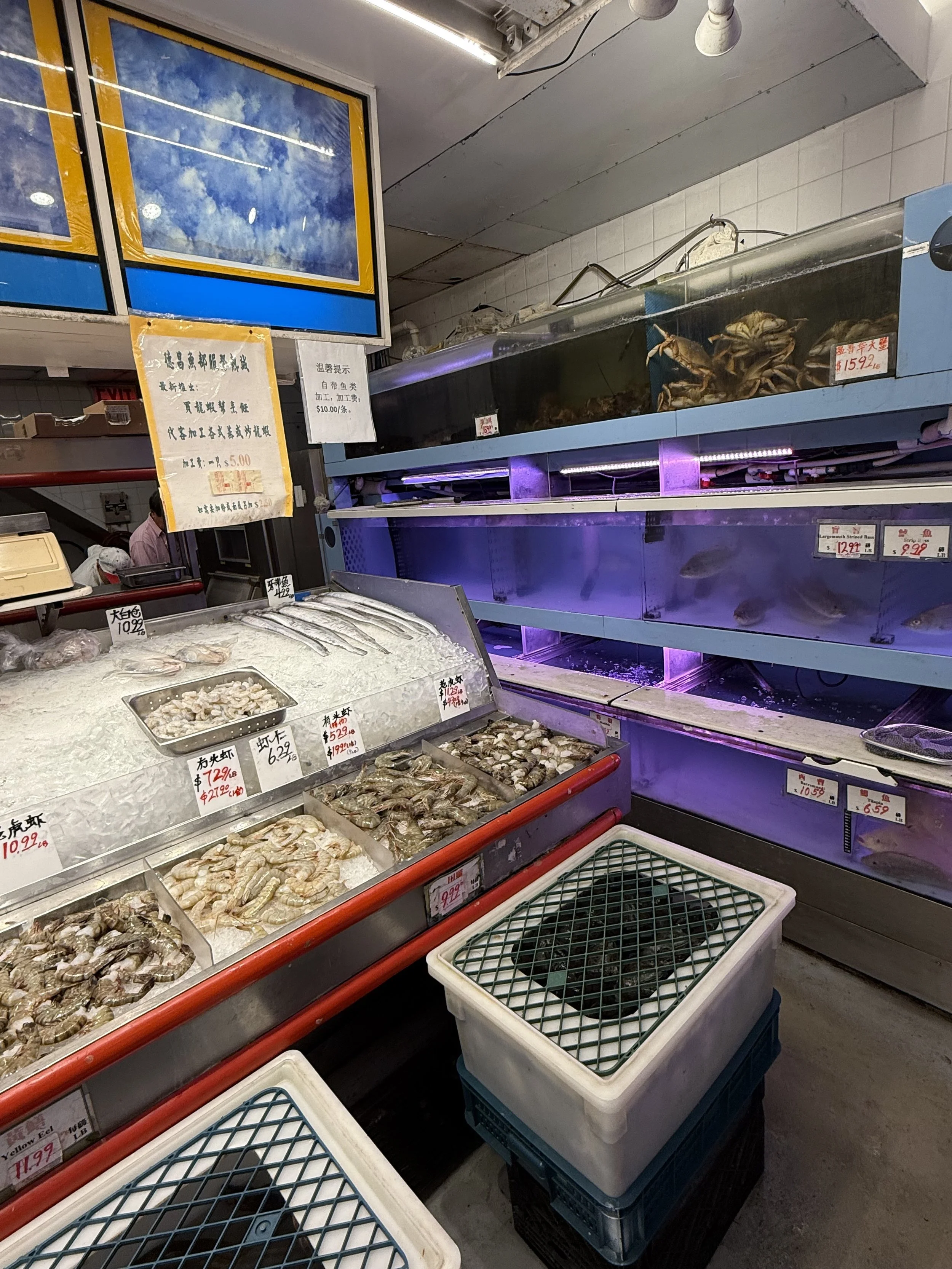 In the corner of the seafood market, two framed photos of the sky hang above rows of tanks and trays of ice. Blue above, blue below—but only one can breathe. The fish and crabsmove slowly, the shrimp frozen mid-curl. The air smells of salt and neon. Somewhere between the tanks and the ceiling, nature has been perfectly rearranged.